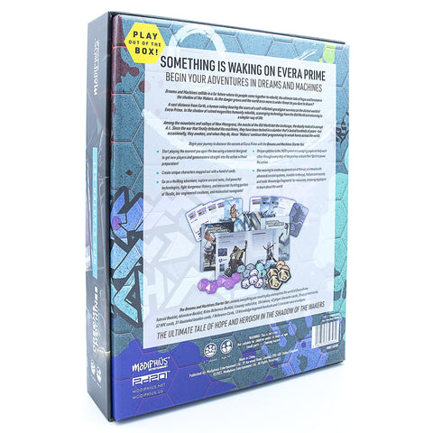 DREAMS & MACHINES: STARTER SET - Dreams and Machines collide in a far future where its people come together to rebuild, the ultimate tale of hope and heroism in the shadow of the Wakers. Danger grows and the world is once more under threat. Do you dare to dream?A vast distance from Earth, a human colony bearing the scars of a self-inflicted apocalypse survives on the distant world of Evera Prime. In the shadow of ruined megacities humanity rebuilds, scavenging technology from the Old World and returning to a simpler way of life. Among the mountains and valleys of New Mossgrove, the mechs of the Old World dot the landscape, deadly tools of a corrupt A.I.. Since the war that finally defeated the machines, they have been locked in a slumber that’s lasted hundreds of years — but occasionally, they awaken, and when they do, these ‘Wakers’ continue their programming to wreak havoc across the world.Begin your journey to discover the secrets of Evera Prime with the Dreams and Machines Starter Set: Start playing the moment you open the box using a tutorial designed to get new players and gamemasters straight into the action without preparation!