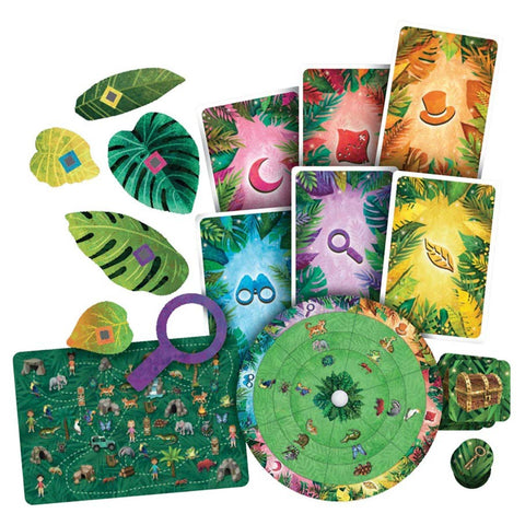 A riddle adventure in the jungle! Working together or by themselves, children ages six and up can solve various riddles to open mysterious treasure chests. In each round, six different types of puzzles, which are shown on 36 illustrated, large-format cards, are combined in new ways. Thus, the game is replayable, offering a new gaming experience in each round. A playful introduction to get young players started in the EXIT: The Game series.
