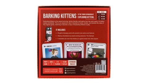 The third expansion to the record-breaking game, Exploding Kittens. Includes 20 cards and instructions that refresh the core game, adding a new level of strategy and hilarity. Includes a pair of Barking Kittens cards that allow players to combine their hands to one's advantage and the other's disadvantage. Also includes a wearable crown that allows you to hold a secret hand of cards on your head that no one can see until you decide to release them into the draw pile.