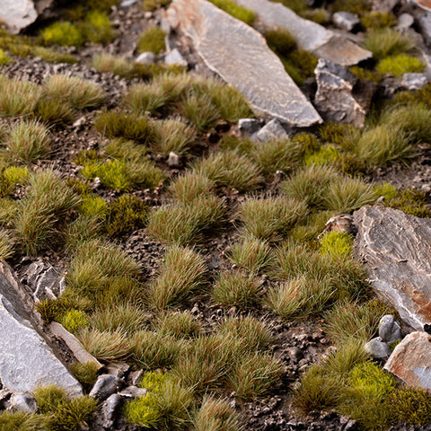 Slightly brownish green tufts. Best used to simulate mediterranean types of prairies, steppes, low scrubs and woodland ground layers, when some drier climate character is wanted. Also perfect to increase colour variation to your scenes, when mixed with other colours and sizes.