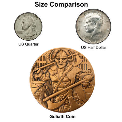 Goliath Coins are collectible display coins. They are incredibly detailed, large metal coins, with sculpted 3D art, that feature characters from gaming, mythology, and pop culture. They can also be used as a game marker, first player token, game prop, inspiration token, deck topper, card guard, or good luck piece.