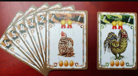 At the end of the game you will gain points from your largest group of hens of the same breed in your barnyard, from your rooster token and from the goal card. Don’t forget some rare hens give you medals worth points at the end of the game.