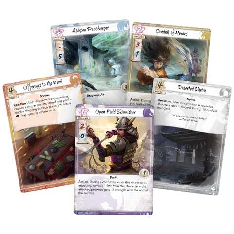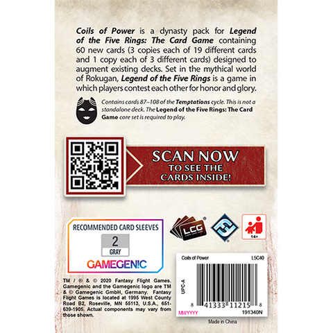 As with the earlier Dynasty Packs of the Temptations cycle, the Coils of Power expansion offers a host of new tools for every Great Clan within this expansion. Multiple clans receive massive new Army characters as war sweeps across Rokugan, while other clans gain unique powers to manipulate the fate on friendly and hostile characters. With a new stronghold, two new provinces, and a full array of dynasty and conflict cards, any dedicated player will want to be sure they pick up Coils of Power.