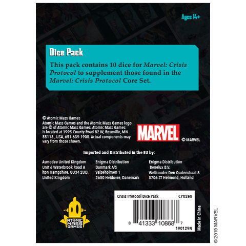 This pack contains 10 dice for Marvel: Crisis Protocol to supplement those found in the Marvel: Crisis Protocol Core Set.