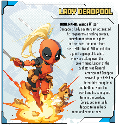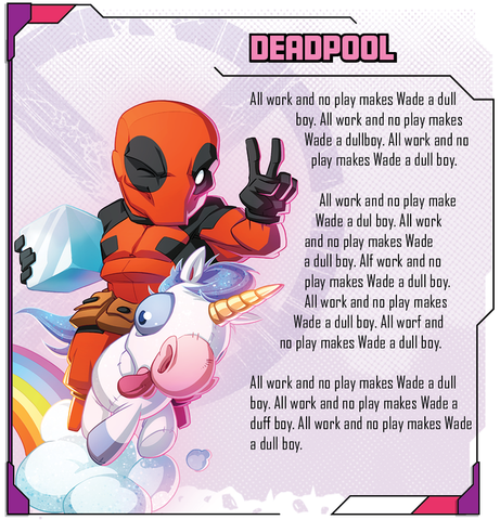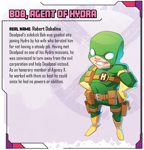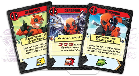 The Deadpool expansion brings you a whopping three flavors of the Merc with a Mouth, as well as his not so trusty sidekick Bob, Agent of Hydra. These most unusual characters can all be played as either Heroes or Villains, always with tongue stuck firmly in cheek. Not content with being just a 4th wall-breaking Hero and unbeatable Villain, Deadpool can also crash into any game, riding his plush unicorn, in the form of a Challenge that sows chaos wherever he goes!