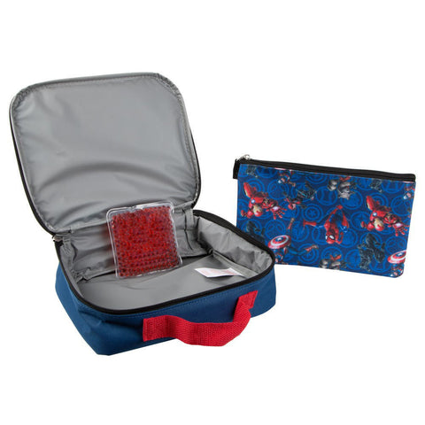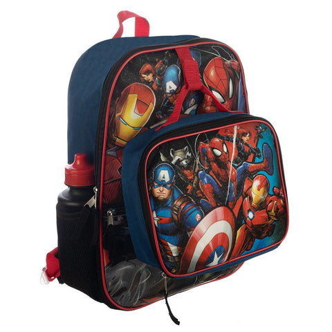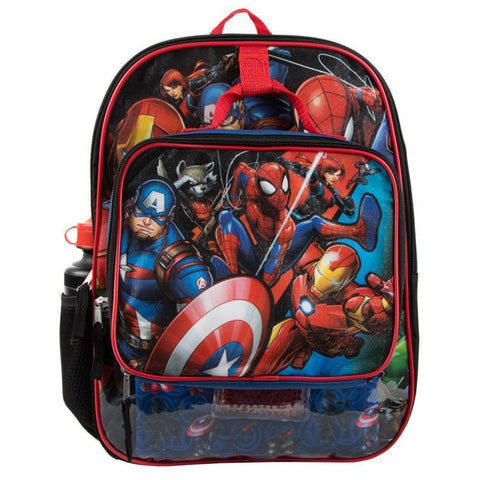5-PIECE SET - The Marvel Comic Book superheroes 5-piece combo set includes a backpack, a lunch box, a water bottle, a zippered utility case, and an ice pack.