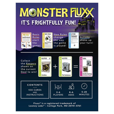Let the monster mash begin! Classic monster movies and TV shows are the theme in this basic Fluxx deck. Despite the prominent monster presence, this deck is Creeper-free. Designed to introduce new players to the Fluxx system, it has just the four main card types and comes in a 2-part style box. Perfect for Halloween parties!