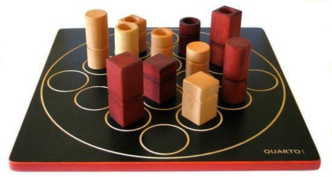 Quarto has a 4×4 board and 16 pieces. Each piece has four dichotomous attributes — color, height, shape, and consistency — so each piece is either black or white, tall or short, square or round, and hollow or solid. The object is to place the fourth piece in a row in which all four pieces have at least one attribute in common. The twist is that your opponent gets to choose the piece you place on the board each turn.