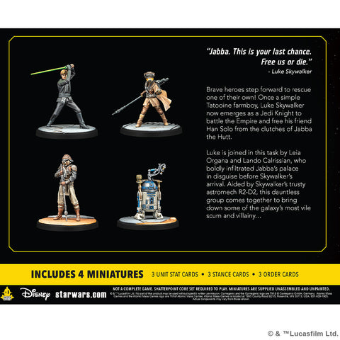 Four iconic heroes join Star Wars™: Shatterpoint in this new pack! With the Force as his ally, Jedi Knight Luke Skywalker leads this squad of Rebels as a Primary Unit. He is joined by Leia Organa in her Boussh disguise as a Secondary Unit while Lando Calrissian and R2-D2 join forces as a Supporting Unit. Based upon these characters' daring mission to rescue Han Solo in Return of the Jedi, they form a full Galactic Civil War-era squad that works particularly well with characters with Rebel Alliance tags.