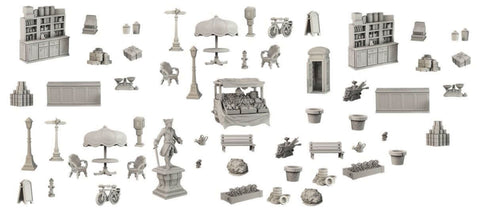 This set contains 68 pieces of scenery for a town square. The scale is 28-30mm, making them perfect for many modern and historical games. The pieces are cast in high quality plastic and are preassembled, ready to play straight out of the box.