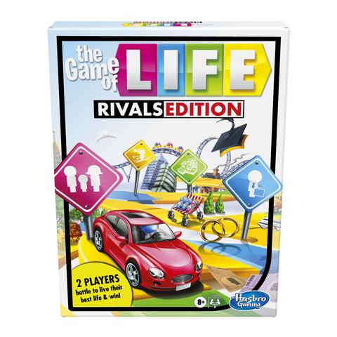 It's The Game of Life game that has 2 players going head-to-head in a battle to live their best life, and to gain the most Life points to win. In this Rivals Edition of The Game of Life game, players choose their car token and move around the board following the instructions on the cards or on the gameboard. Drawing a Life card could gain you points or make you pay -- but watch out! It could also allow your opponent to steal your stuff! Neighborhood Gossip spaces and Baby spaces on the board add to the suspense throughout the journey. This two-player The Game of Life game takes less time to play than the classic The Game of Life game. It's a great choice for a play date, a rainy day activity, or anytime your kids want a fun game to play with a friend. For ages 8 and up.Hasbro Gaming and all related trademarks and logos are trademarks of Hasbro, Inc.TWO-PLAYER GAME: The Rivals Edition of The Game of Life board game is an exciting game that has 2 players going head-to-head in a battle to live their best life and winGET LIFE POINTS TO WIN: Show off the new house and kids' successes to gain Life points – but don't let the neighbor know about skeletons in the closetQUICK GAMEPLAY: With The Game of Life Rivals game, players can experience faster gameplay than the classic The Game of Life game