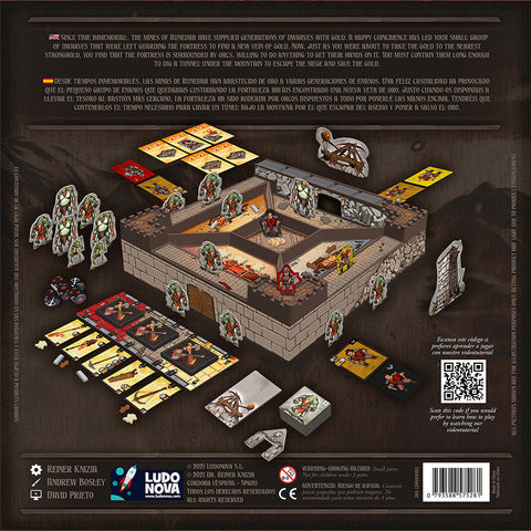 The Siege of Runedar is a cooperative game for 1 to 4 players. Players take on the role of dwarves charged with defending the walls of Runedar and the treasure they keep within. They will have to face orcs, goblins and trolls, fight in hand-to-hand combat against those who manage to get past the walls and shoot from a distance at those who try to enter. A deck-building system allows them to upgrade their weapons and tools, as they must hold off the raiders long enough to build a tunnel to escape the terrible siege they have been subjected to and get the treasure to safety.
