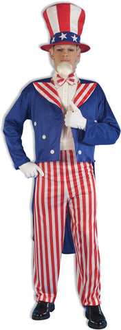 - Includes Uncle Sam's blue, red, and white tailcoat, red and white striped pants, and coordinating bow tie and hat