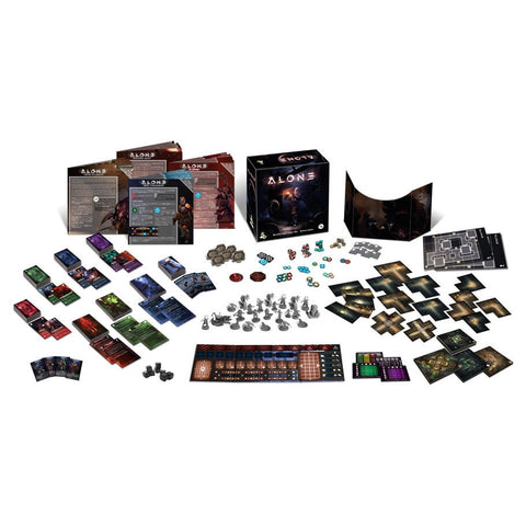 Alone is a science-fiction survival horror/dungeon crawler game for 2 to 4 players. In this game one player controls the Hero, who has a limited amount of time to complete missions while exploring a map full of dangers and traps. The other 3 players control the forces of Evil that always have the full map of the scenario in front of them, hidden behind a huge screen, managing all the events and trying to stop the Hero from completing his objectives. The Hero instead can only see the sector of the map he is in, and from there he will have to explore the map. At the end of each round, only the sector he is in will stay visible, and he will have to put his memory to test!