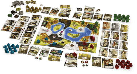 The game board represents one of the regions where the four people are in conflict with one another, with each area characterized by a different terrain type and the presence of different resources. Card-playing and board expansions are fully integrated, as many cards will have greater effects if you control the right territories. Using the resources produced by their cards or collected from the board, players can acquire and add to their deck new cards, representing the new settlers and their crafts.