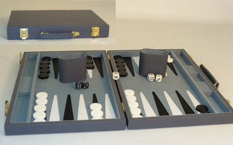 Grey Vinyl Backgammon Attache with Handle - Black & White Stitched Pips - 2 Cups - Dice - Doubler. Dimensions 19" x 14.75" Open. Black and white stitched pips offer a raised texture for backgammon checker placement. Includes checkers, two cups, two pairs of dice, and a doubler. Attaché case with handle makes for no-hassle transportation and closes firmly with golden clasps.