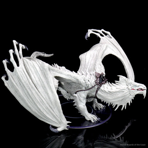 White dragons tend to be the smallest of the chromatic dragons, but Arveiaturace is enormous - crouched over and standing at 7.5 inches tall, this figure measures 16.5 inches from nose to tail with a wingspan of 17 inches. Whether intimidating your party of adventurers or standing guard on your shelf as a display piece, the ancient white dragon is hand painted, showing the detail of the sculpt and accentuating every jagged scale.