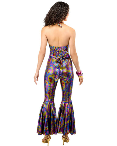 - Features a funky mod halter neck jumpsuit with extra wide, flared/pleated bell bottoms