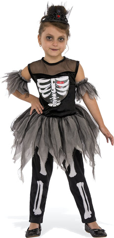 Pirouette into a spooky spectacle with the Girls Sweet Skelerina Skeleton Costume—it’s *to die for*! This enchanting outfit features a delicate balance of creepy and cute, with skeleton-inspired detailing and a tutu fit for a ghostly prima ballerina. Including the dress, her leggings, armbands, and printed skeleton print on the body and legs. Best fitting for twirling through the haunted halls or adding a touch of elegance to the eerie, it’s the ultimate choice for a bone-chilling performance.