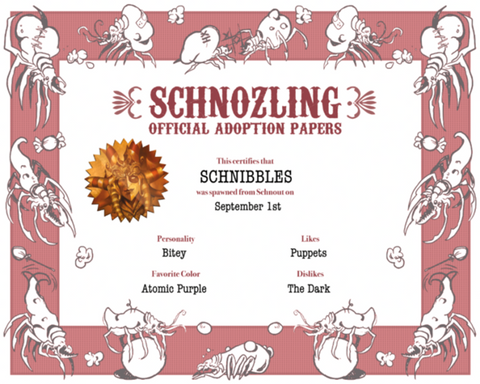 Get your very own lifesize 1:1 grey schnozling familiar that you can paint! Each Schnozling includes adoption papers with the Schnozling's name, personality, likes, dislikes, and favorite color! Also comes with a Schnozling mini to represent your new bab.