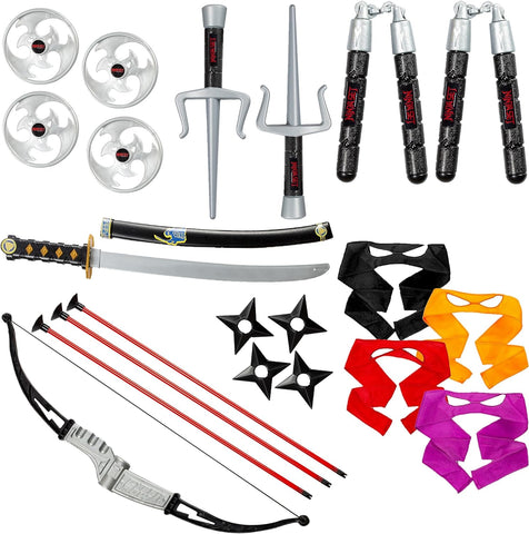 - Includes 1 Katana, 1 Scabbard, 4 Flying Discs, 4 Shooting Stars, 2 Sais, 2 Ninja Sticks, 4 Eye Masks, 1 Bow, and 3 Arrows