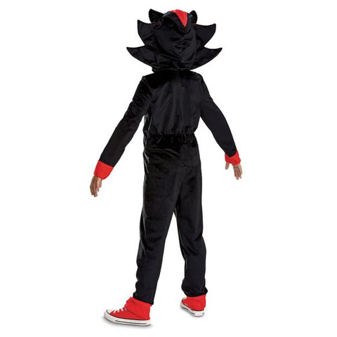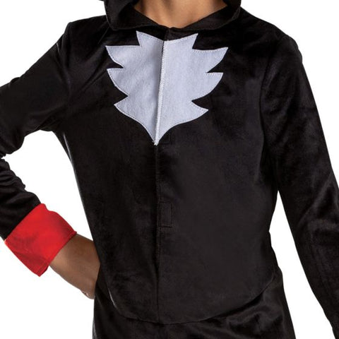- Features black hooded jumpsuit with Shadow character hood with quills, eyes, and ears