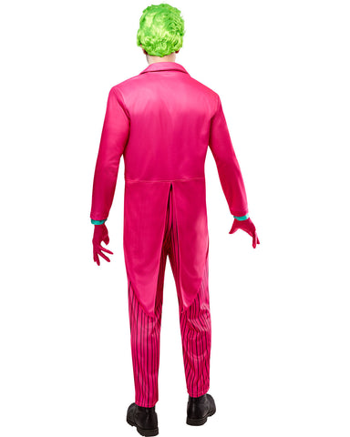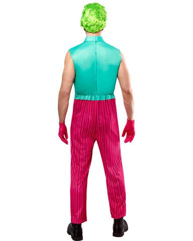 - Includes long-sleeve purple/pink jumpsuit with attached teal/green vest and pin striped pants, matching gloves, and bright green wig