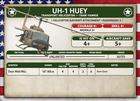 Contains two plastic UH-1 Huey helicopters, two plastic flight stands, eight rare-earth magnets, one decal sheet and two unit cards.