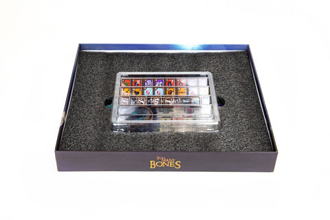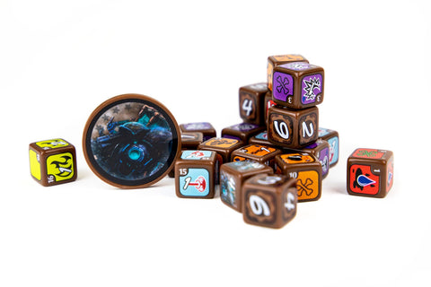Gasket comes with its own set of 21 beautiful custom dice, a weighted character chip, a closable dice holder, and a neoprene character mat.