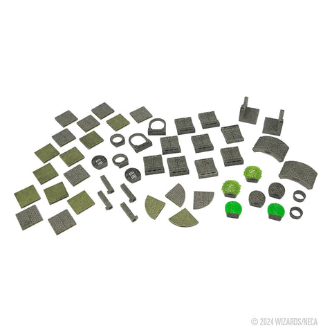 This WarLock set includes new double-sided sewer channel tiles and walkway tiles. Channel tiles depict murky sewer water on one side and stone tiles on the other and can be stacked to create a rising tide effect. Walkway tiles serve as narrow passages to avoid the murky sludge and have worn wooden slats on one side and stone tiles on the other. Additionally, this set has full-height grime-stained sewer walls that are curved inward to invoke the feel of an underground tunnel.